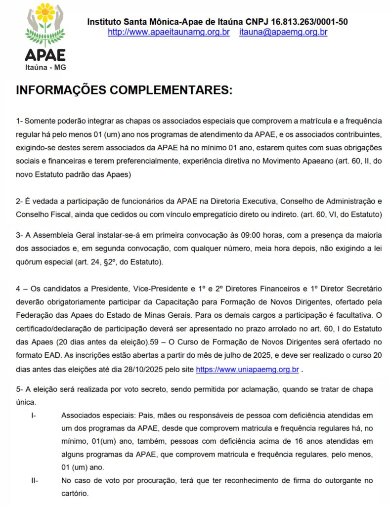 EDITAL DE CONVOCAÇÃO ASSEMBLEIA GERAL ELEIÇÃO APAE ITAÚNA